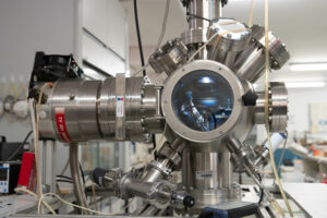 A multifunctional vacuum chamber with multiple CF confocal ports, capable of reaching pressures as low as 10⁻⁷ mbar. It can be used to fabricate thin films of metallic nanoparticles ranging from 5 to 10 nm in size, with the possibility of embedding them in different matrices (metallic or insulating).